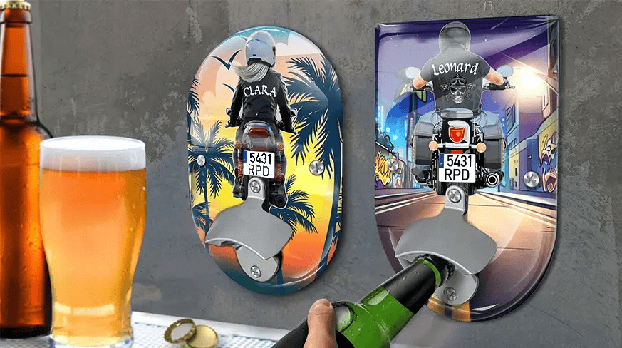 Tilpass veggflaskeåpneren din med motorsykkel, nummerskilt og navn nå!
