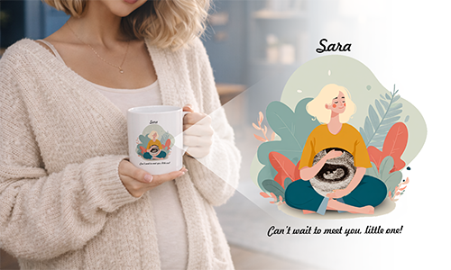 Få en personlig graviditetsmugg som berättar din unika historia. Vår design med en gravid kvinna kompletteras av ett personligt ultraljudsfoto (med namn eller egen text). Ett kärleksfullt minne av väntan på ditt barn. Högkvalitativt tryck, tålig mugg och diskmasksskyddad.